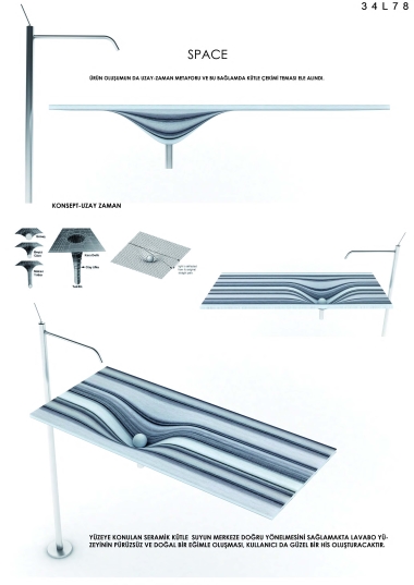 Ürün oluşumun da uzay-zaman metaforu ve bu bağlamda kütle çekimi teması ele alındı. Yüzeye konulan seramik kütle suyun merkeze doğru yönelmesini sağlamakta lavabo yüzeyinin pürüzsüz ve doğal bir eğimle oluşması, kullanıcı da güzel bir his oluşturacaktır.