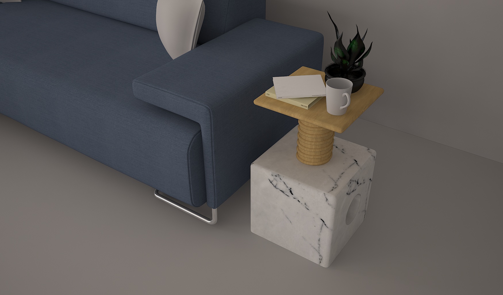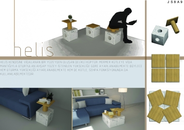 iç mekanlarda farklı işlevlerde kullanılabilme imkanı da sağlayan helis,mermerin estetik duruşunu yansıtan bir tasarımdır.küp kütle ve ona vidalanan üst kısmı ayarlanabilir oturma elamanından bir sehpaya da dönüşebilmektedir. vidalama mantığı ile yükseklik ayarlanabilmektedir. yanlardaki delikler hem kütleyi hafifletmekte hem de taşıma için tutma alanı oluşturmaktadır