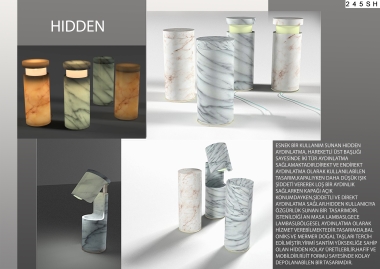 Esnek bir kullanım sunan hıdden aydınlatma, hareketli üst başlığı sayesinde iki tür aydınlatma sağlamaktadır.direkt ve endirekt aydınlatma olarak kullanılabilen tasarım,kapalıyken daha düşük ışık şiddeti vererek loş bir aydınlık sağlarken kapağı açık konumdayken,şiddetli ve direkt aydınlatma sağlar.hıdden kullanıcıya özgürlük sunan bir tasarımdır.istenildiği an masa lambası,gece lambası,bölgesel aydınlatma olarak hizmet verebilmektedir.tasarımda bal oniks ve mermer doğal taşları tercih edilmiştir.